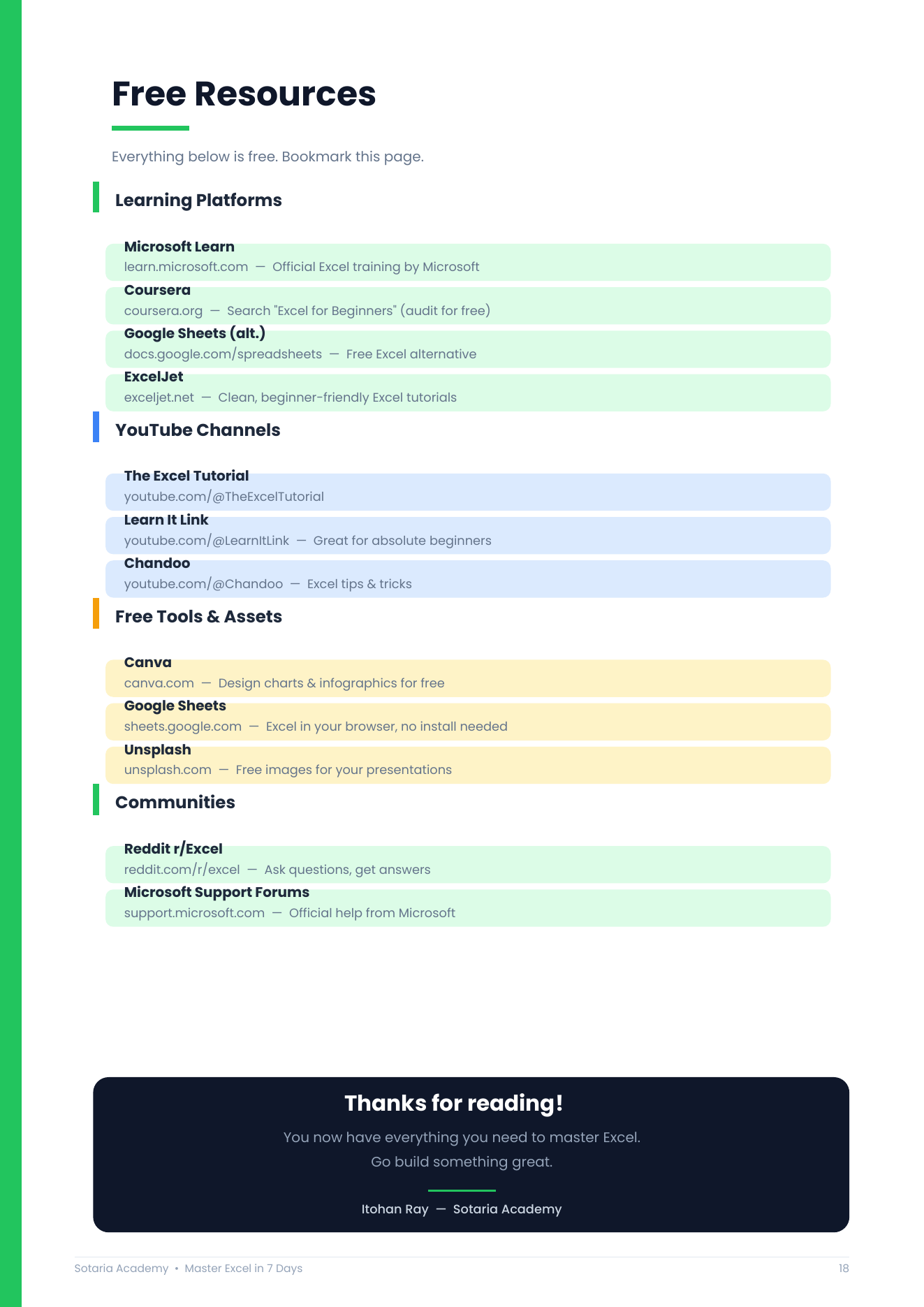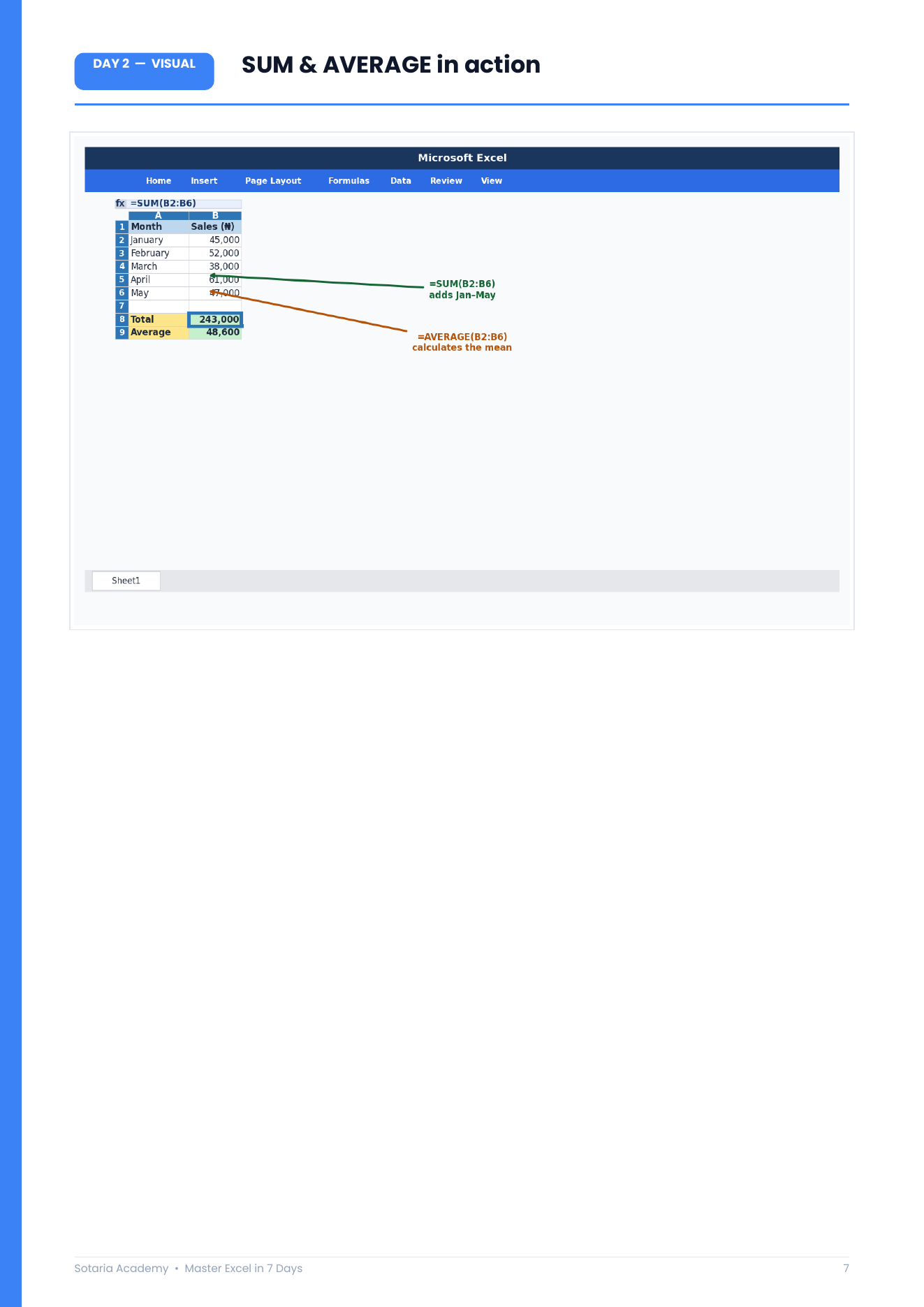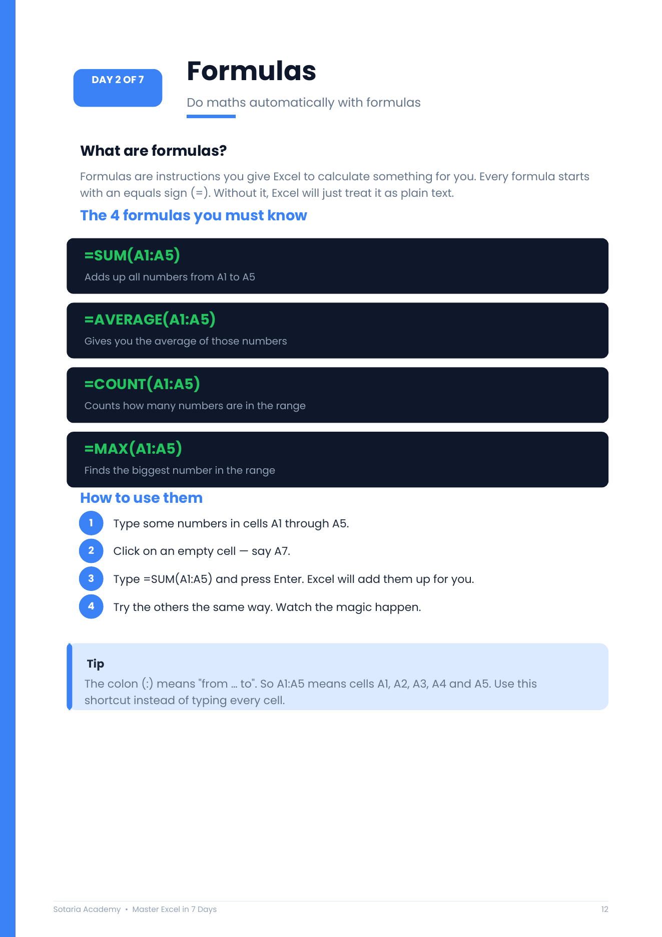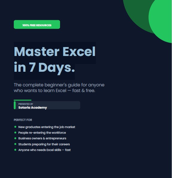 Each day is designed to take 30–45 minutes. By Day 7, you’ll be genuinely comfortable in Excel — not just skimming the surface.